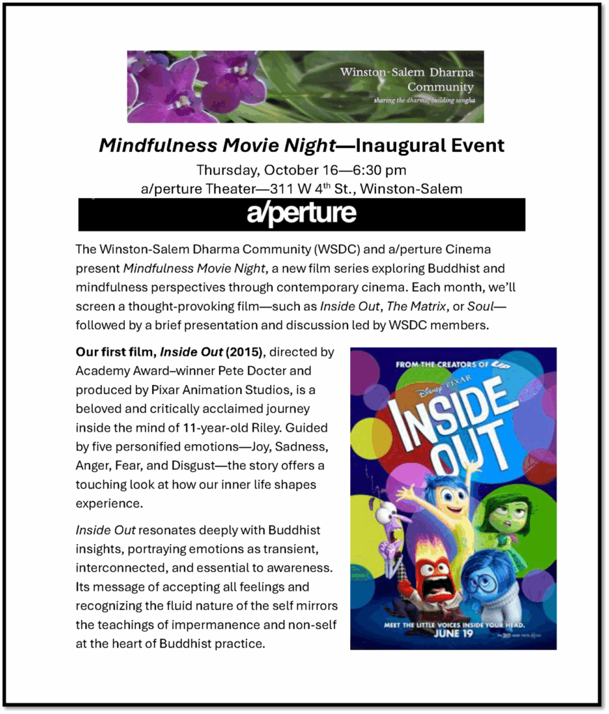 New Film Series: MOVIES AND MINDFULNESS–WATCH, REFLECT, & CONNECT–A monthly film-and-discussion series blending art, awareness, and community conversation—where stories on screen spark insight off screen.